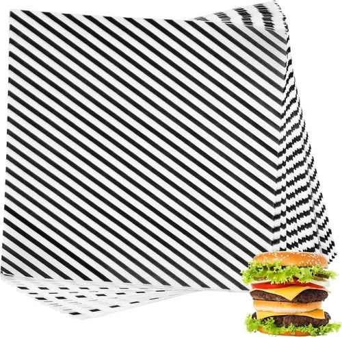 PAQUETE: Incluye 200 hojas de papel encerado seco para delicatessen de 12 x 12 pulgadas a rayas blancas y negras MATERIAL: Hecho de material de papel resistente al desgarro, resistente a la grasa y de grado alimenticio, el patrón a cuadros azules hace que tu parrillada sea tan deliciosa y clásica como tu comida Multifunciones: estos revestimientos de papel para bandejas de alimentos son ideales para usar para envolturas de sándwich de comida rápida, envolturas de delicatessen, envases de alimentos y revestimientos de cestas de alimentos para hamburguesas, papas fritas y otras comidas grasosas Ocasiones: estos forros de papel para bandejas de alimentos son ideales para almuerzos escolares, cafeterías, delicatessen, restaurantes, camiones de comida, picnics, barbacoas, puestos de concesión, carnavales, festivales, fiestas y más actividades AHORRO DE MICROONDAS: Disponible para horno microondas, más conveniente para calentar tu comida con nuestro papel delicatessen.
