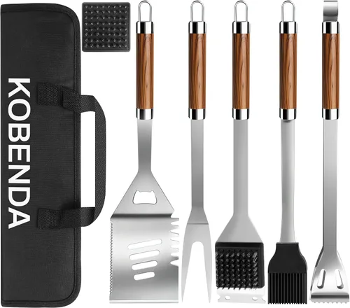 Juego de herramientas profesionales para barbacoa de 7 piezas: El accesorio para barbacoa consiste en incluir espátula, tenedor, pinzas, cepillo de aplicación, cepillo de limpieza, reemplazo de cabezal de cepillo, todo en una bolsa de almacenamiento de alta calidad. Herramientas de barbacoa diseñadas para asar a la parrilla perfecta, puedes convertirte en el maestro de la parrilla de tu patio trasero. Herramientas de parrilla resistentes y duraderas: nuestro juego de herramientas para barbacoa está hecho de acero inoxidable de alta calidad, que es resistente al calor, a prueba de óxido, seguro y duradero. Puedes disfrutar fácilmente de la barbacoa, acampar sin preocuparte por que las herramientas se doblen o se rompan. El mango es lo suficientemente largo para cocinar de forma segura, haciendo carne a la parrilla perfecta. Juegos de herramientas versátiles para barbacoa: cada juego de utensilios para parrilla cuenta con prácticos anillos colgantes para almacenamiento organizado y mango ergonómico de grano de madera con agarre cómodo. La espátula combina un abridor de botellas integrado y un borde dentado para voltear y cortar alimentos sin esfuerzo. Estas herramientas de barbacoa pueden manejar fácilmente una variedad de platos de carne. Fácil de limpiar y almacenar: nuestro juego de herramientas de plancha es apto para lavavajillas o se lava fácilmente a mano con agua y limpiador. Recuerda secar cada herramienta antes de guardarla para asegurarte de que esté seca y evitar la oxidación. Cada herramienta se puede colocar perfectamente en una bolsa de almacenamiento para un fácil transporte y asar en el patio trasero. Gran opción de regalo: como un regalo ideal para barbacoa, los accesorios de parrilla KOBENDA pueden adaptarse perfectamente a varias ocasiones, cumpleaños, bodas, día de San Valentín, día del padre, Navidad. Regalos de barbacoa para hombres, papá, marido, esposa. Si encuentras algún problema, ponte en contacto con nosotros y lo resolveremos rápidamente por ti.