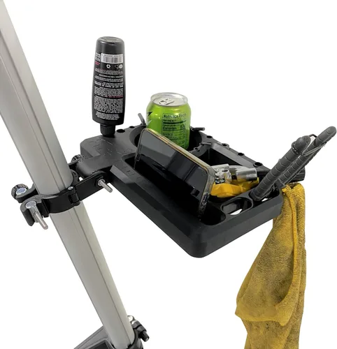 Desbloquea tus habilidades mecánicas de bicicleta con la bandeja de herramientas Tilt Industries Mantenga sus herramientas, lubricante, trapo y cualquier otra cosa que pueda necesitar a mano para mantener su bicicleta funcionando sin problemas. Si eres como nosotros, un video tutorial en línea es imprescindible al sangrar los frenos o jugar con un gotero quisquilloso, es por eso que hemos diseñado un lugar en la bandeja para sostener tu teléfono para una fácil visualización. ¿Mencionamos el portavasos? Tienes que mantenerte hidratado mientras tratas de luchar con ese molesto neumático nuevo en la llanta. Nuestra bandeja de herramientas universal es el complemento perfecto para tu variedad de productos Tilt Industries Mejora tus habilidades de manejo de bicicletas junto con tus habilidades de mantenimiento de bicicletas. Estamos redefiniendo la conducción y el entrenamiento y todo lo relacionado con el ciclismo de montaña. Aprovecha al máximo tus productos Tilt Industries completando tu juego con la bandeja universal para herramientas.