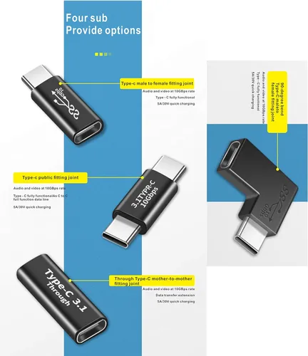 Nota: 1. Al realizar una potencia de 100W, es necesario asegurarse de si el extremo frontal puede cumplir con las condiciones 2. La velocidad de carga y transmisión de datos depende del equipo, el cargador de pared y el cable tipo C Características: 1.30 V puede soportar voltaje, y la corriente máxima es de 5 A. 2. Diseño simple que hace que sea fácil de conectar y usar. 3. Soporta función completa tipo C, carga rápida y transmisión de audio y video, con una tasa de hasta 10 GBps Especificaciones: 1. Conector: adaptador de codo de 90 grados macho a USB-C hembra de 90 grados, adaptador 1USB-C macho a USB-C hembra, 1USB-C macho a USB-C macho adaptador, adaptador 1USB-C hembra a USB-C hembra 2. Color: negro