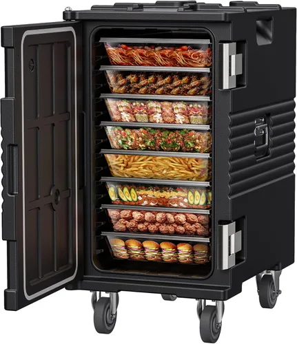 ESTRUCTURA DE ACERO INOXIDABLE 304: El calentador de alimentos de caja caliente cuenta con un diseño duradero que resiste el transporte y los elementos. El eje de puerta de acero inoxidable 304 integrado soporta el uso frecuente y mejora la longevidad del calentador, eliminando la necesidad de reemplazar las bisagras debido al óxido o rotura. El pestillo de puerta de acero inoxidable 304 proporciona un sellado hermético para preservar la temperatura, resistente al óxido, abolladuras y daños Ruedas giratorias de 360° de alta resistencia: el calentador de alimentos para portón trasero se destaca con ruedas giratorias mejoradas, ofreciendo una maniobrabilidad y durabilidad superiores. Dos ruedas giran 360 grados para un fácil movimiento en cualquier dirección y cuentan con un mecanismo de bloqueo total para mayor estabilidad. Además, dos ruedas de dirección fija mejoran el control. Fabricadas con materiales de primera calidad y soportan hasta 330 libras cada una, estas ruedas garantizan fiabilidad y robustez para cualquier desafío de catering, ya sea en una cocina ocupada o en un evento Aislamiento no eléctrico de 6 horas: nuestro calentador de alimentos de caja caliente cuenta con una carcasa de LLDPE de doble pared y grado alimenticio rellena de espuma de poliuretano de grado comercial, junto con una tira de sellado de inserción extraíble para un sellado mejorado y aislamiento. Mantiene la comida caliente o fría durante 4-6 horas sin necesidad de electricidad. NOTA: NO ALMACENAR COMIDA CALIENTE Y FRÍA JUNTOS AL MISMO TIEMPO Gran capacidad para un uso versátil: este transportador de sartenes de 127 cuartos de galón ofrece un amplio espacio para contener hasta 8 sartenes de tamaño completo de 2.5 pulgadas de profundidad (no incluidas), ya sea llenas de platos fríos o calientes. Su diseño de múltiples ranuras se adapta a varios tamaños de bandejas de alimentos. También sirve como un espacioso cubo de hielo de 127 cuartos de galón. Es ideal para servicios de catering, comedores, restaurantes, hoteles a gran escala, eventos corporativos, entrega de alimentos, camiones de comida, vendedores ambulantes, uso doméstico, actividades al aire libre y campamento. Este calentador de alimentos portátil es una opción versátil para cualquier ocasión ACCESO EFICIENTE Y AHORRO DE ESPACIO: Este calentador de alimentos portátil para catering tiene una puerta de carga frontal que se abre hasta un ángulo completo de 270°, proporcionando un fácil acceso a su comida. Su diseño superior ranurado permite un apilamiento conveniente, ayudando a ahorrar espacio. Con asas superiores integradas, 1-2 personas pueden levantarlo con facilidad. El calentador también tiene 4 ruedas para un transporte sin esfuerzo