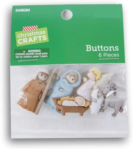 Conjunto de botones navideños con temática de natividad 6 piezas Incluye a María, José, niño Jesús, un ángel, una oveja y un burro Cada botón mide aproximadamente 1 pulgada de alto Perfecto para ropa de Navidad, manualidades y mucho más