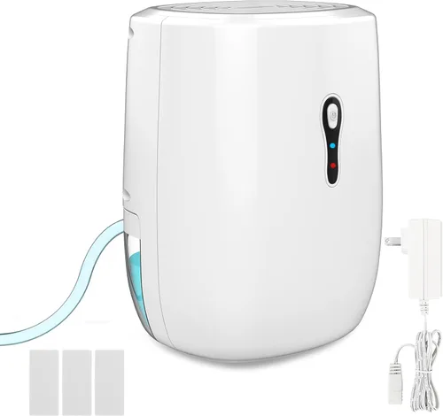 【Seguro de usar】El transformador externo convertirá 120VAC en 9VDC para alimentar el cuerpo del deshumidificador. No hay alto voltaje en el cuerpo del deshumidificador. Seguro de usar. 【Eficiente】Deshumidificador eficiente para espacios de menos de 108 pies cuadrados. pies Puede extraer hasta 360 ml/12 onzas (a 86 °F, 80% HR) de agua de espacios pequeños por 24 horas. 【Manguera de drenaje de 4 pies】La manguera de drenaje de silicona suave le evitará tener que sacar el tanque de agua para vaciar el agua acumulada cada 3~7 días. 【Función de apagado automático y memoria】Diseño de apagado automático y memoria. Si elige usar el tanque de agua, se apagará automáticamente cuando el tanque esté lleno. El deshumidificador volverá a funcionar una vez que vacíes el agua y vuelvas a colocar el tanque de agua. Diseño confiable para un funcionamiento continuo: el diseño y los componentes confiables permiten que este deshumidificador funcione 24/7 continuamente. 【Almohadillas autoadhesivas para fijación】Se proporcionan 3 almohadillas autoadhesivas para fijar el cuerpo del deshumidificador en la encimera o la mesa para evitar que se mueva, especialmente cuando se usa en un remolque de RV, autocaravana o barco. 【Abrazaderas de manguera proporcionan para enrutar la manguera】Cuando usas la manguera de silicona incluida para el drenaje continuo, puedes usar esas abrazaderas de manguera para hacer una ruta adecuada.