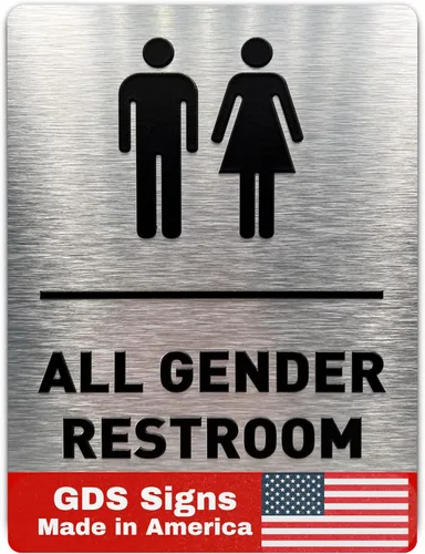 GDS - Letrero de baño para baño con todo género, compatible con la ADA, accesible para silla de ruedas, iconos elevados y braille de grado 2,
