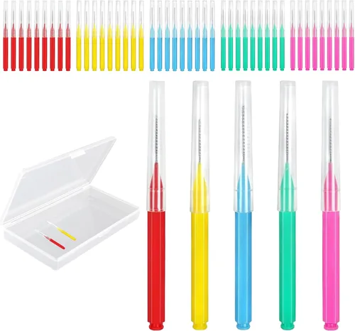 Lo que obtienes: hay 50 cepillos interdentales en total, que tienen 5 colores y 10 para cada color, cantidad suficiente para satisfacer tus necesidades de uso diario y reemplazos. Cada juego se empaqueta en una caja de almacenamiento transparente. Diseño práctico: las cerdas de hilo dental para tirantes son suaves y no dañarán tu encía. Su mango antideslizante está diseñado para ser ergonómico, y el agarre cómodo hace que sea fácil de sostener y operar entre los dientes. Limpieza eficiente: el cabezal limpiador de llaves es flexible y se puede doblar libremente para limpiar los dientes. Su longitud de 0.9 in le permite penetrar profundamente en el espacio de los dientes y limpiar fácilmente los detalles, eliminando el sarro y los residuos de dientes. Almacenamiento portátil: este cepillo tiene una tapa transparente, que puede proteger las cerdas y mantenerlo limpio. Puedes llevarlo en tu bolsillo cuando salgas para que puedas usarlo en cualquier momento y en cualquier lugar. Aplicación diaria: nuestro kit de aparatos ortopédicos es perfecto para el uso diario, se puede utilizar para limpiar restos de comida después de las comidas, especialmente cuando estás fuera. Es adecuado para personas que tienen dificultades para limpiar sus dientes con aparatos ortopédicos.
