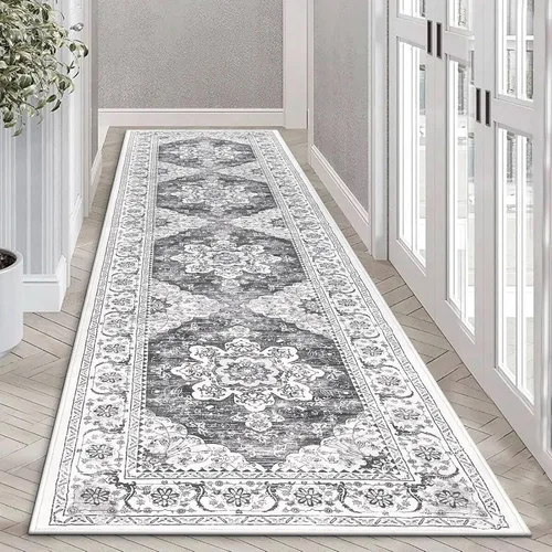 Ileading Alfombra vintage para pasillo, lavable a máquina, con parte trasera de goma, antideslizante, para entrada, dormitorio, sala de estar (gris,