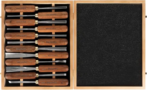 Cabezales de cincel afilados – Precisamente preafilados a máquina para todos los cinceles Cuchilla: todas las cuchillas están hechas de acero al cromo-vanadio y endurecidas a Rockwell C60, por lo que las cuchillas mantendrán un borde durante años de uso Mango: el mango de madera de teca es más duro y cómodo de usar Caja de madera: todas las piezas mejoradas incluyen paneles de doble capa, estructura ampliada, bisagra gruesa, embalaje en buzón con protección EPE, para mantener las herramientas de torneado y el estuche en buenas condiciones Contenido - 5 x gubias rectas de 0.157 in, 0.236 in, 0.315 in, 0.551 in, 0.787 in; 2 x recto profundo gubia: 0.118 in, 0.394 in; 1 cincel recto: 0.315 in; 1 x separación recta en V: 0.236 in; 1 x cuchara de 0.394 in; 1 x ranura curva: 0.787 in; 1 cincel sesgado: 0.315 in