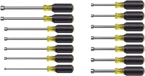 El juego incluye destornilladores de tuercas magnéticas estándar de tamaños 3/16, 1/4, 5/16, 11/32, 3/8, 7/16, 1/2 pulgadas con ejes huecos cromados de 6 pulgadas y mangos de agarre de cojín (Klein Tools 647M). El juego contiene destornilladores de tuercas métricas de tamaños 5, 5.5, 6, 7, 8, 9 y 0.394 in con ejes huecos cromados de 3 pulgadas y mangos de agarre de cojín (Klein Tools 65160). Las puntas magnéticas de tierras raras en los controladores de tuercas estándar mantienen los sujetadores en su lugar. Las bridas internas en ambos tipos de destornilladores de tuercas proporcionan un anclaje de eje sólido y resistente a la torsión. Cúpulas de mango codificadas por colores en los controladores de tuercas estándar y puntas en los destornilladores de tuercas métricas para una fácil identificación del tamaño.