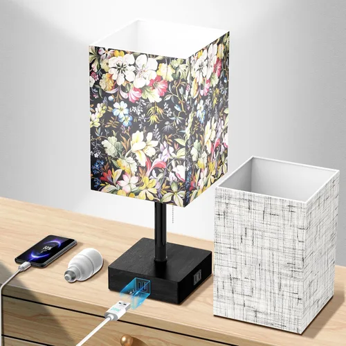 Lámparas de mesa para dormitorio, pequeña lámpara de mesita de noche con puerto USB y tomas, luces decorativas de flores para sala de estar, estudio, oficina en casa, dormitorio, biblioteca
