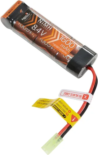 Batería recargable NiMH de 8.4V 1600mAh hecha de baterías NiMH de 7 celdas 2/3A. Compatible con pistolas de airsoft como AK, MP5, SCAR, M249, M240B, M60, RPK, PKM, G36C, M4A1-RIS/M4A1, CAR 15, MP5SD6, MC51, FNP90, G3A4 y otros. Para AEG actualizados y/o modificados, recomendamos medir el compartimento de la pistola para un mejor ajuste. Mide 4.4 pulgadas (longitud), 1.5 pulgadas (ancho) y 0.8 pulgadas (altura) y pesa 6.17 onzas. El paquete de baterías de repuesto Airsoft incluye un conector de batería Tamiya, un mini conector hembra Tamiya ensamblado con cable de 16 G.