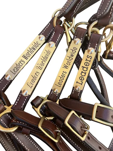 Leaders se complace en mostrar nuestra línea de exquisitos cabestros de cuero de 3/4 pulgadas. Estos cabestros son fabricados y vendidos por la familia, lo que los hace exclusivos de nuestra tienda. El cuero utilizado es increíblemente suave y flexible, con un acabado de anilina. Este cuero poroso es altamente absorbente, lo que permite un fácil engrasado y encerado. También es naturalmente curtido vegetal, sin el uso de productos químicos agresivos. Además, estos cabestros cuentan con cuero doble grueso y duradero, junto con herrajes de latón macizo resistente. Las hebillas están especialmente diseñadas con pasadores de acero para una mayor durabilidad. La corona del halter está equipada con dos hebillas, la garganta está enrollada con un broche resistente y la barbilla también es ajustable para un ajuste perfecto y seguro. Además, ofrecemos la opción de personalizar su halter con una o dos líneas de grabado. Simplemente indique el texto deseado para la Línea 1 (Nombre) y/o Línea 2 (Nombre). Ten en cuenta que para cabestros de tamaño mini o pequeño poni, utilizamos una placa de nombre ligeramente más pequeña. Leaders se enorgullece de ofrecer productos ecuestres de clase mundial.