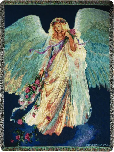 algodón Manta de tapiz tejida con flecos Tamaño generoso: 50 x 60 pulgadas; cubre una cama, colócala sobre un sofá o adorna una cómoda silla Imagen de Mary Baxter St. Clair presenta un ángel volador que echa flores Fabricado en Estados Unidos Busca los carpinteros manuales para encontrar almohadas a juego y otros artículos de decoración