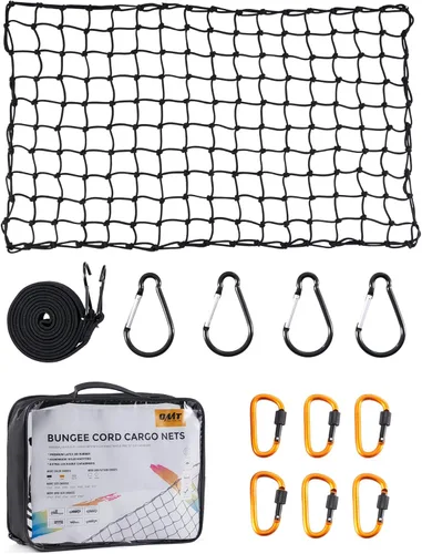 Amplia compatibilidad: Esta red de carga de tamaño completo se extiende desde su área habitual de 2 x 3 pies a más de 4 x 6 pies para adaptarse a cabinas de SUV, barras de techo, portadores de carga y mucho más Malla superior: A pesar de su tamaño amplio, nuestra red de carga elástica para camioneta es ideal para sujetar objetos más pequeños, gracias a su tamaño de malla anudada a mano de 2 x 2 pulgadas, fiabilidad y resistencia Materiales de alta calidad: Esta red elástica para camas de camiones y estantes de techo está hecha de goma de látex premium envuelta en polipropileno especialmente recubierto para mayor elasticidad y resistencia; los mosquetones proporcionados utilizan acero 45# de grado estructural y aleación de aluminio anodizado para un rendimiento sin corrosión sin importar el clima o la temporada Configuración instantánea, fácil almacenamiento: Conecta nuestra red elástica con los 10 mosquetones de bloqueo y pera suministrados o utiliza tus propios ganchos y luego ata tu carga con la correa de retención proporcionada; entre los transportes, nuestra red de portaequipajes se empaqueta firmemente en la bolsa de transporte incluida para un fácil almacenamiento y transporte - -