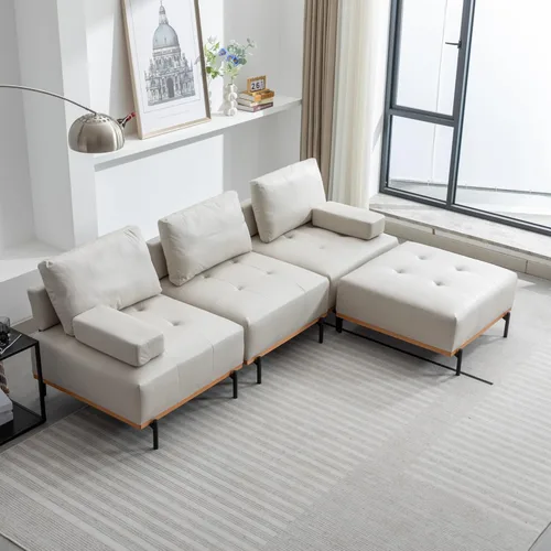 Descripción del producto Diseñado en una forma de L única, este sofá no solo proporciona un amplio espacio para sentarse, sino que también añade un toque moderno y elegante a tu sala de estar, creando un ambiente acogedor y acogedor. Y la otomana está diseñada de forma independiente, puedes cambiar su posición y función para adaptarse a tu espacio y necesidades. Peso y dimensiones Tipo de producto: Sofá Disponibilidad de vídeo: Sí Dimensión total: 100.7 "D* 70.1 "W* 33.8 "H Peso del producto: 177.47 lbs Capacidad de peso (por asiento): 264 Ibs Altura del asiento: del piso al asiento: 18.1" Profundidad del asiento de adelante a atrás: 33" Altura del respaldo: asiento a parte superior de la espalda: 16.5" Color: gris/beige Material de la tapicería: Tela Palomino Material del marco: Hierro+madera contrachapada Construcción del asiento: espuma Material de la pata: Metal Respaldo extraíble: Sí Funda de respaldo extraíble: sí. Cojín extraíble: No Funda de cojín extraíble: Sí Tamaño del paquete Cantidad del Paquete: 1 33.86 x 33.86 x 12.99 pulgadas. 52.91 libras. Cantidad del Paquete: 1 33.86 x 33.86 x 12.99 pulgadas. 52.91 libras. Cantidad del Paquete: 1 33.86 x 33.86 x 12.99 pulgadas. 52.91 libras. Cantidad del Paquete: 1 33.86 x 33.86 x 12.99 pulgadas. 44.09 libras. Cuidado del producto: Polvo regularmente. Limpiar suavemente con un paño limpio y ligeramente húmedo. Se recomienda una limpieza profesional. Evite la luz solar directa. Nunca aplique ni limpie con productos químicos agresivos. Notas 1. Se ha utilizado la medición manual, puede haber algún error razonable. 2. Todas las imágenes son tomadas por muestras reales, puede producirse una ligera aberración cromática debido a la iluminación o la pantalla.