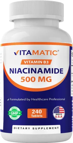 Vitamatic Niacinamida 500 mg 240 Tabletas - Vitamina B3 sin rubor - Apoya la producción de energía